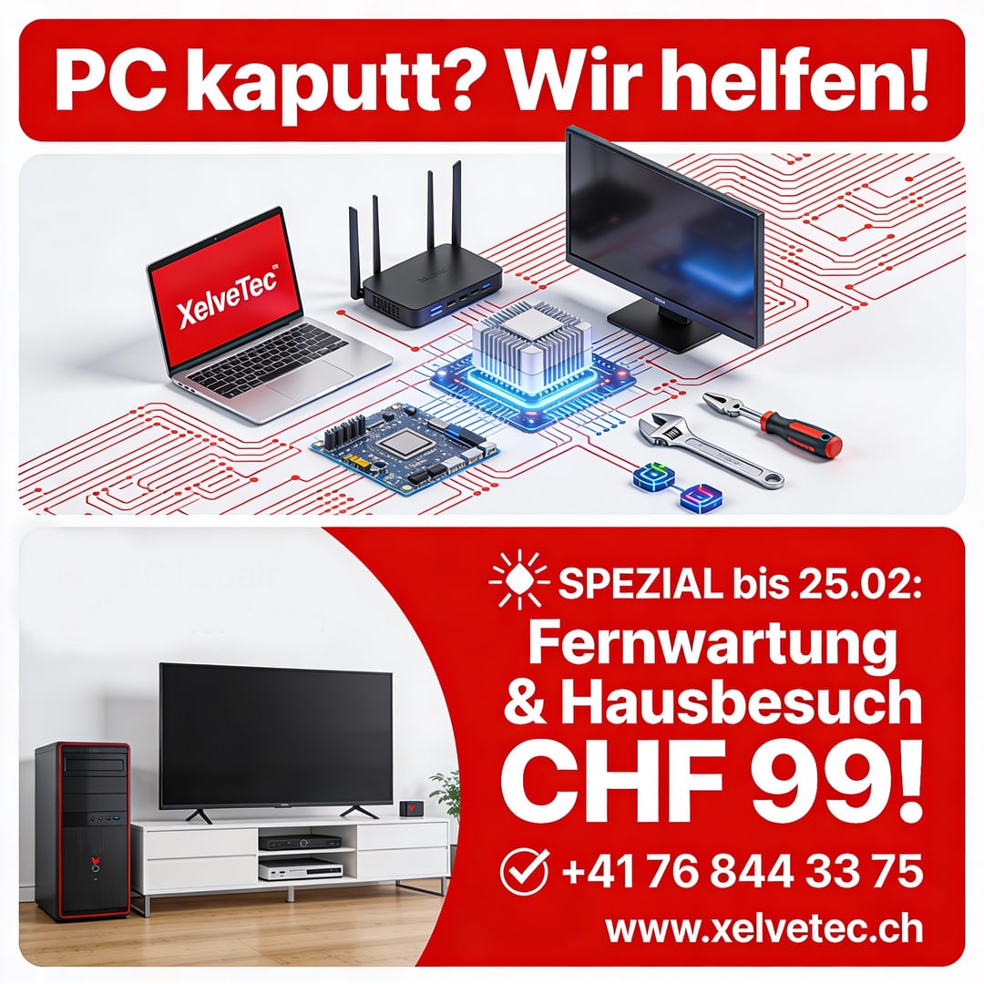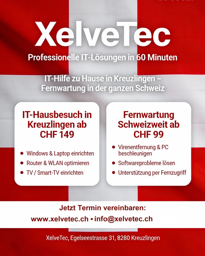 💻 XelveTec – Dein IT-Partner in Kreuzlingen! 🚀 Professionelle PC/Laptop-Reparatur 🛠️, Fernwartung ab CHF99, Windows-Setup, Router/WLAN-Optimierung 🔒, Smart-TV-Einrichtung 📺. Hausbesuche in Thurgau oder remote Schweizweit. Transparent, datenschutzkonform, 24/7 erreichbar. Seit 2025 für Privat & KMU.